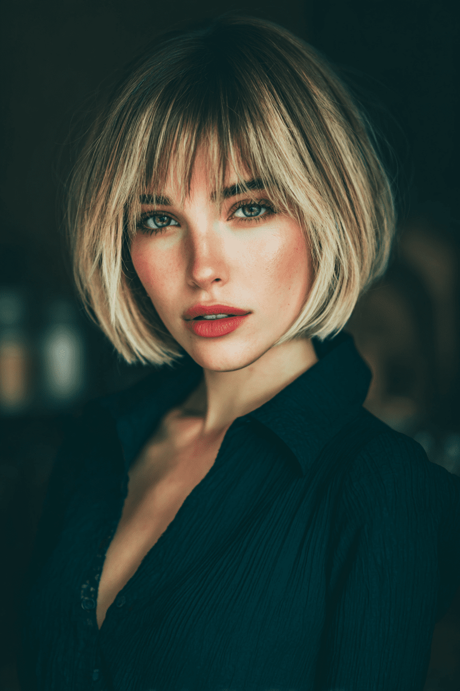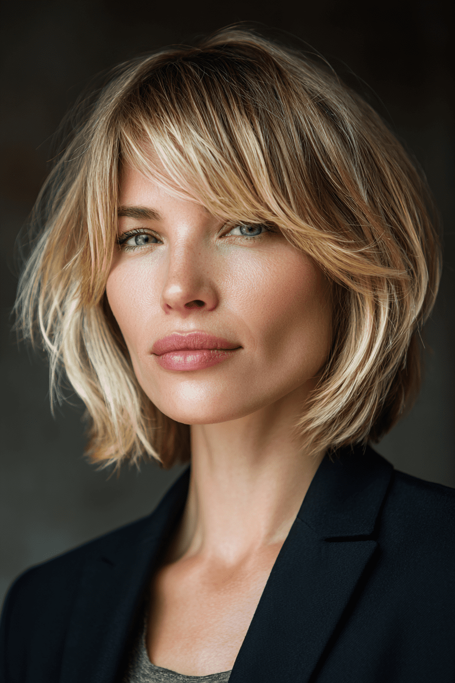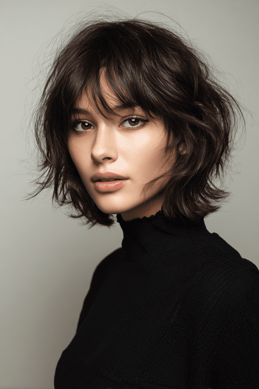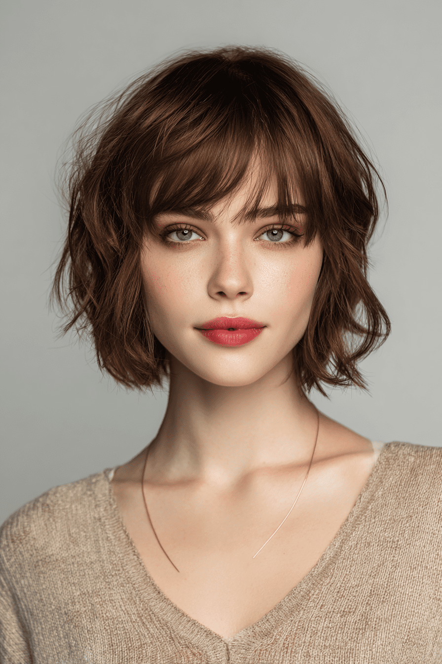 This hairstyle suits a wide range of face shapes. It’s especially flattering on oval and heart-shaped faces, as the bangs draw attention to your eyes while the layered bob softens the jawline beautifully. If you want a versatile, low-maintenance cut that’s fun yet sophisticated, this is an easy winner.