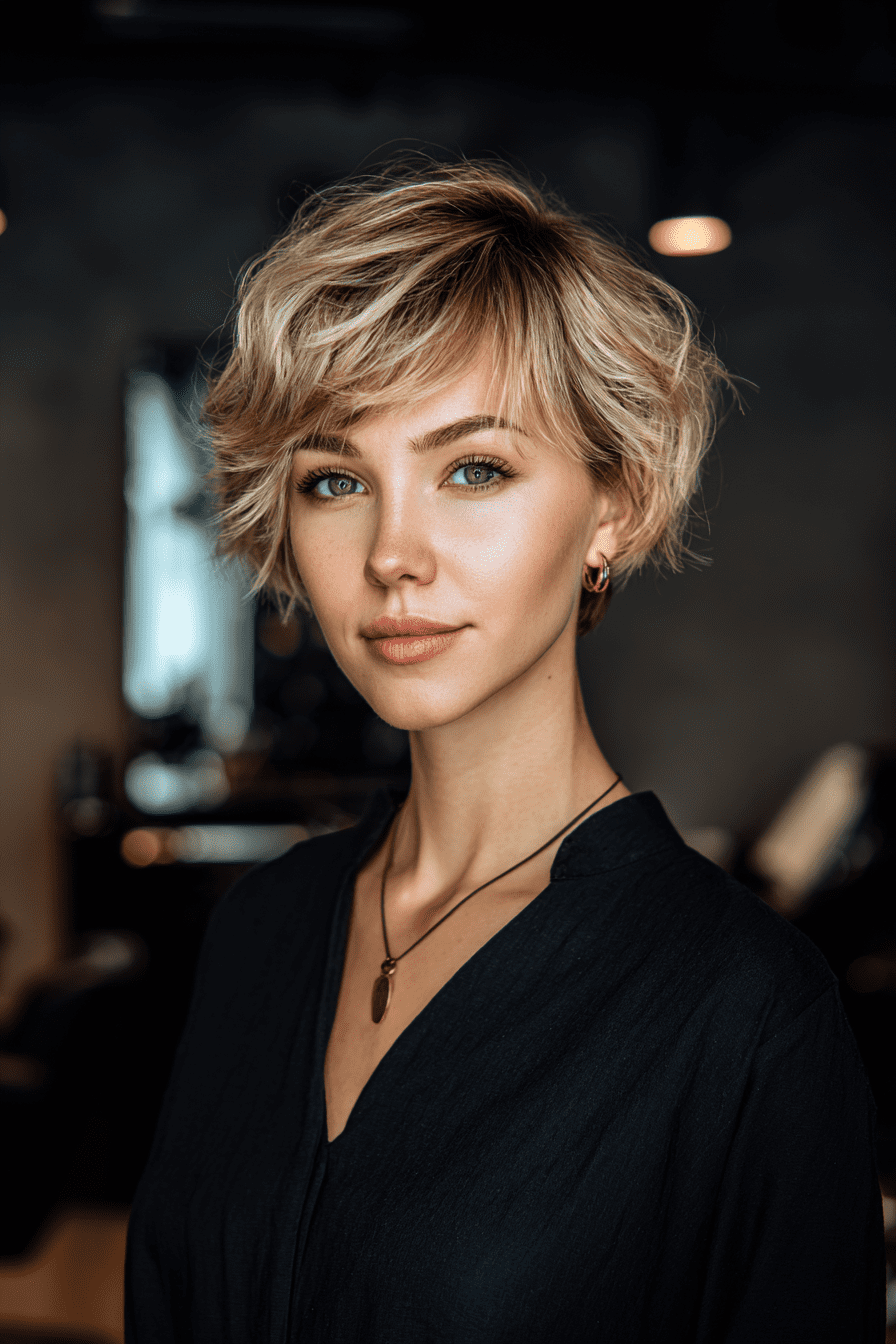 The pixie bob is the perfect mix of short and stylish! It blends the neat shape of a bob with the cute, cropped feel of a pixie cut. This hairstyle keeps the back and sides short while leaving a little more length on top and around the face, which gives your hair some fun movement and shape. It’s great for fine hair because it adds volume and fullness without needing much effort. Just a quick style and you’re good to go!