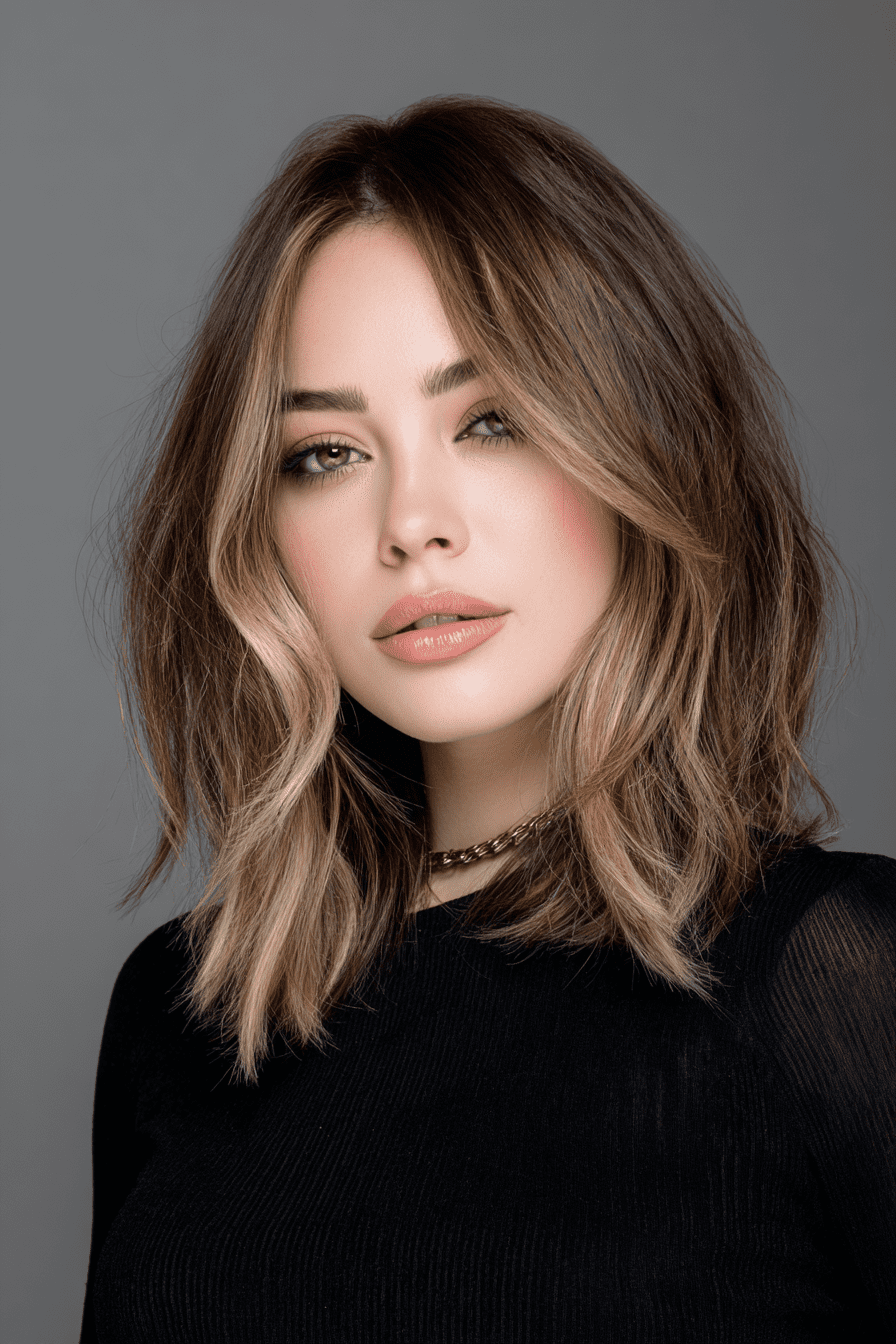 This lob is extra pretty because of the balayage color! Balayage means soft, natural highlights that look like the sun lightened your hair. With a lob (long bob), the color blends beautifully from darker roots to lighter ends. It adds shine, depth, and makes thin hair look fuller. You don’t need to style much—just let the color and cut do the work. It’s perfect if you want a fresh, easy, and stylish look!