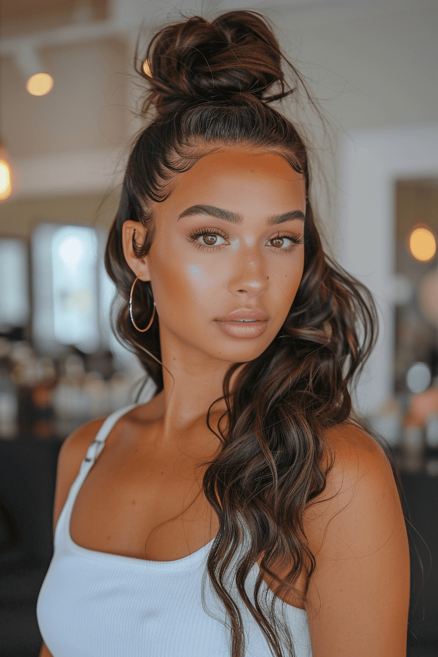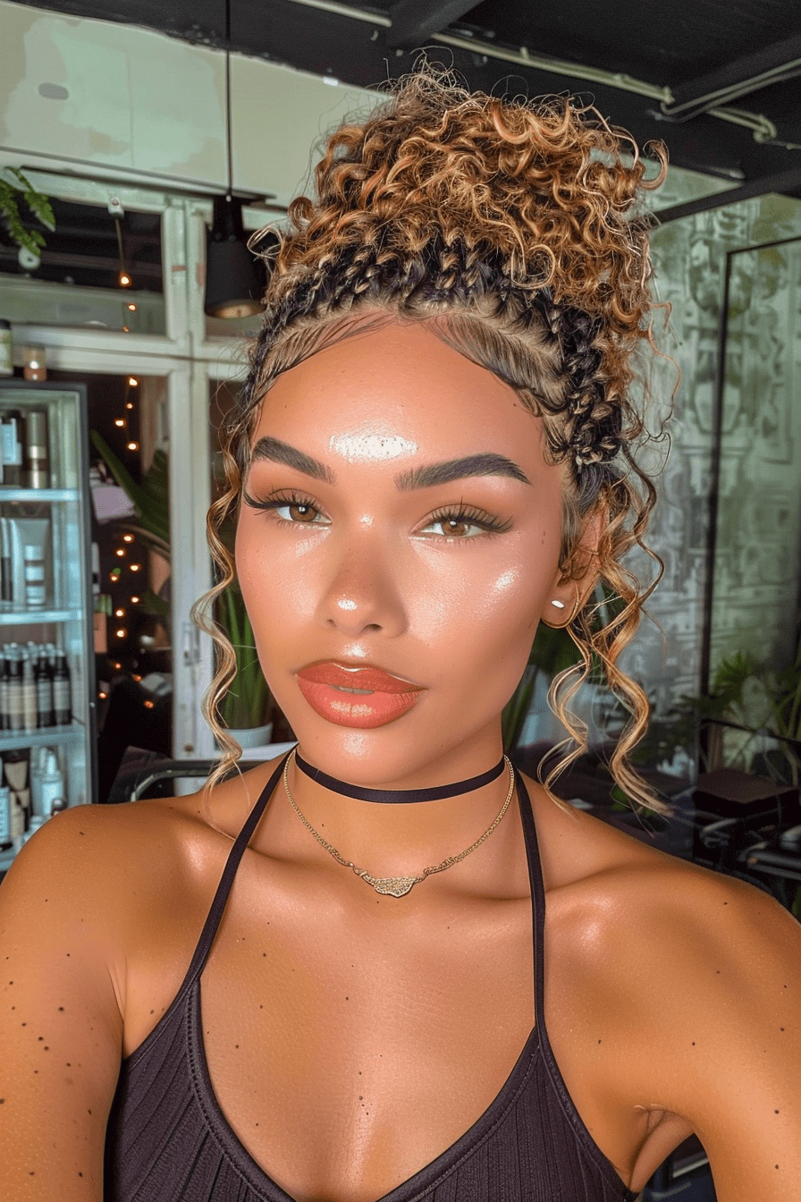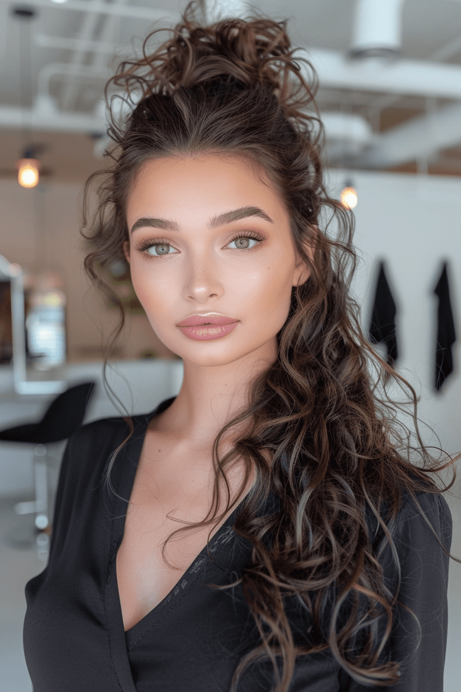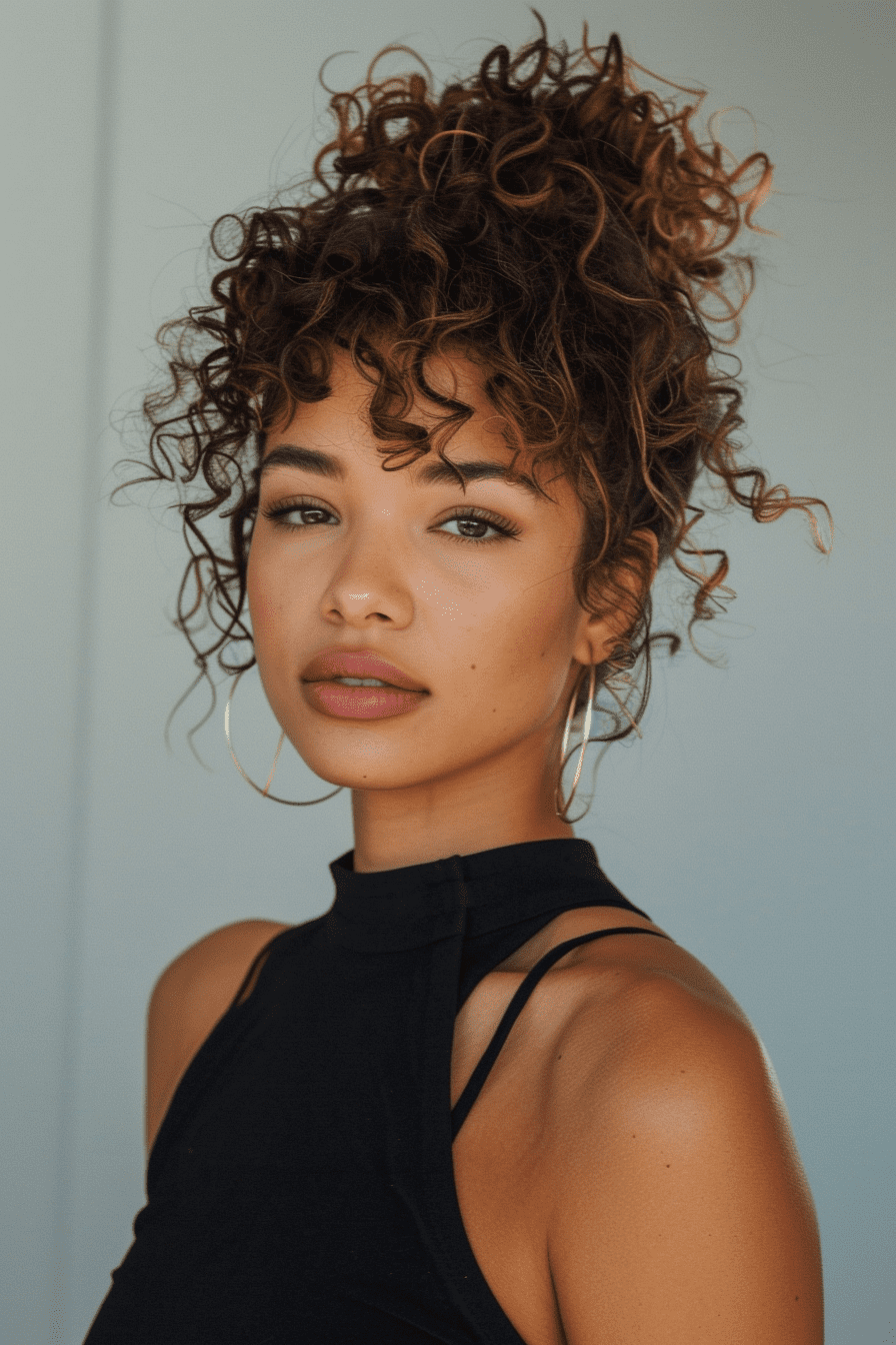 This style feels relaxed but elevated. The half-up bun keeps volume while showing off the curls’ natural body.
