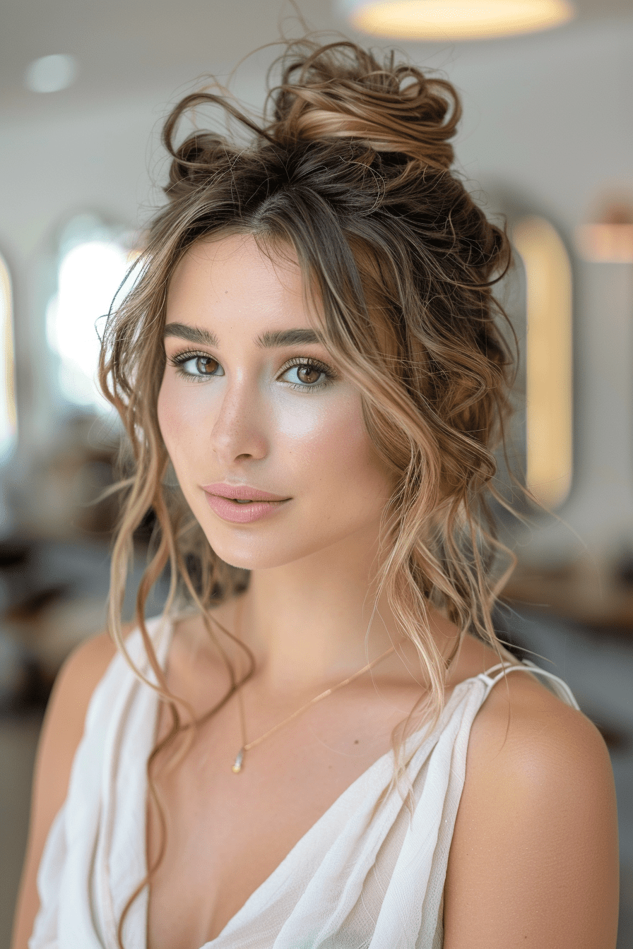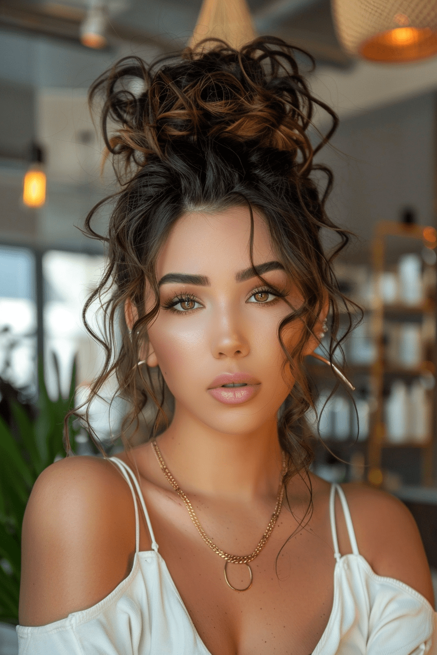 19. Messy Curly Bun with Face-Framing Curls