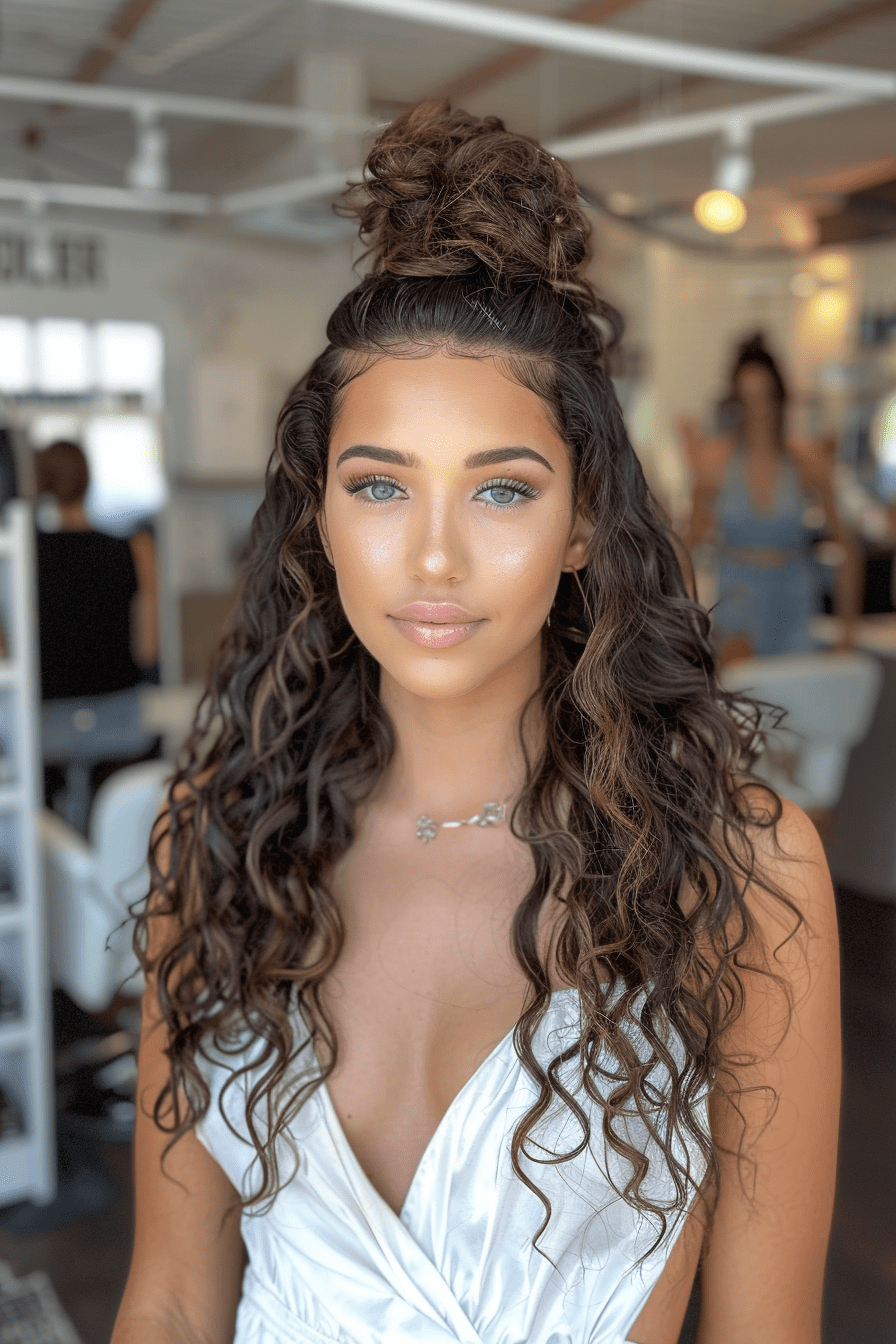 The half-up section lifts the face while the curls flow naturally.