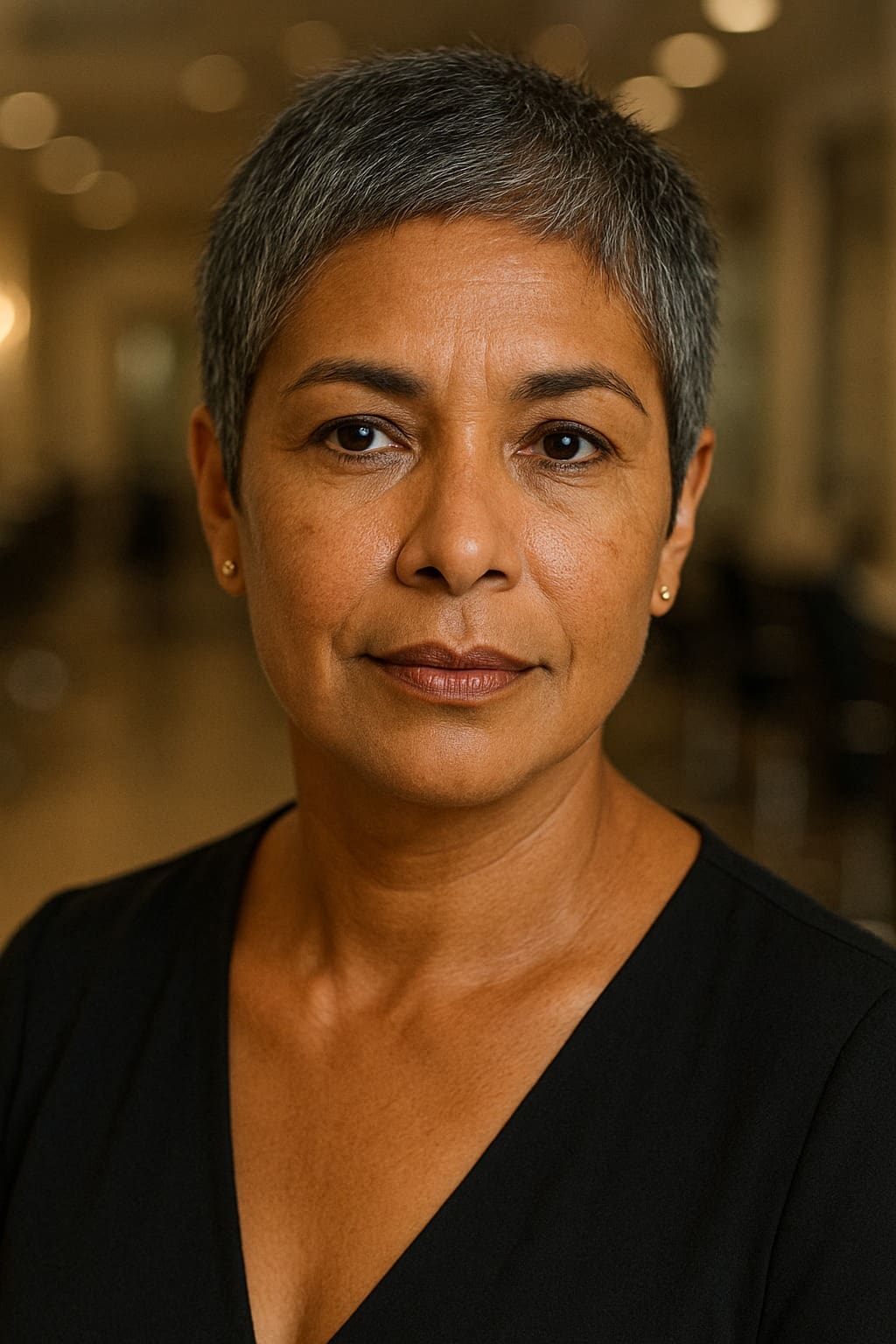 This bold buzzcut shows off your natural salt and pepper color beautifully. The short length keeps things low-maintenance, while the fade on the sides adds a cool, modern edge. It highlights your facial features and brings attention to your eyes and cheekbones. This cut is great for women in their 50s who want something fresh, powerful, and easy to style. Just a bit of shine spray and you’re good to go!