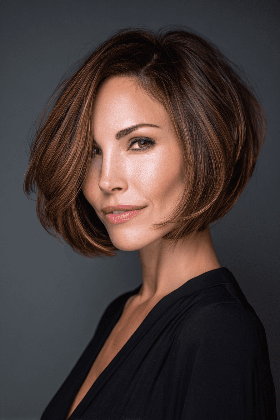 A stacked bob is a chic and modern short hairstyle that’s all about volume and shape. It features shorter layers in the back that gradually get longer toward the front, creating a softly rounded silhouette that lifts the crown and adds body to fine hair. This angled shape helps your hair look fuller and thicker without needing a lot of styling. Whether worn straight or with soft waves, the stacked bob is stylish, easy to maintain, and perfect for a fresh, full look!