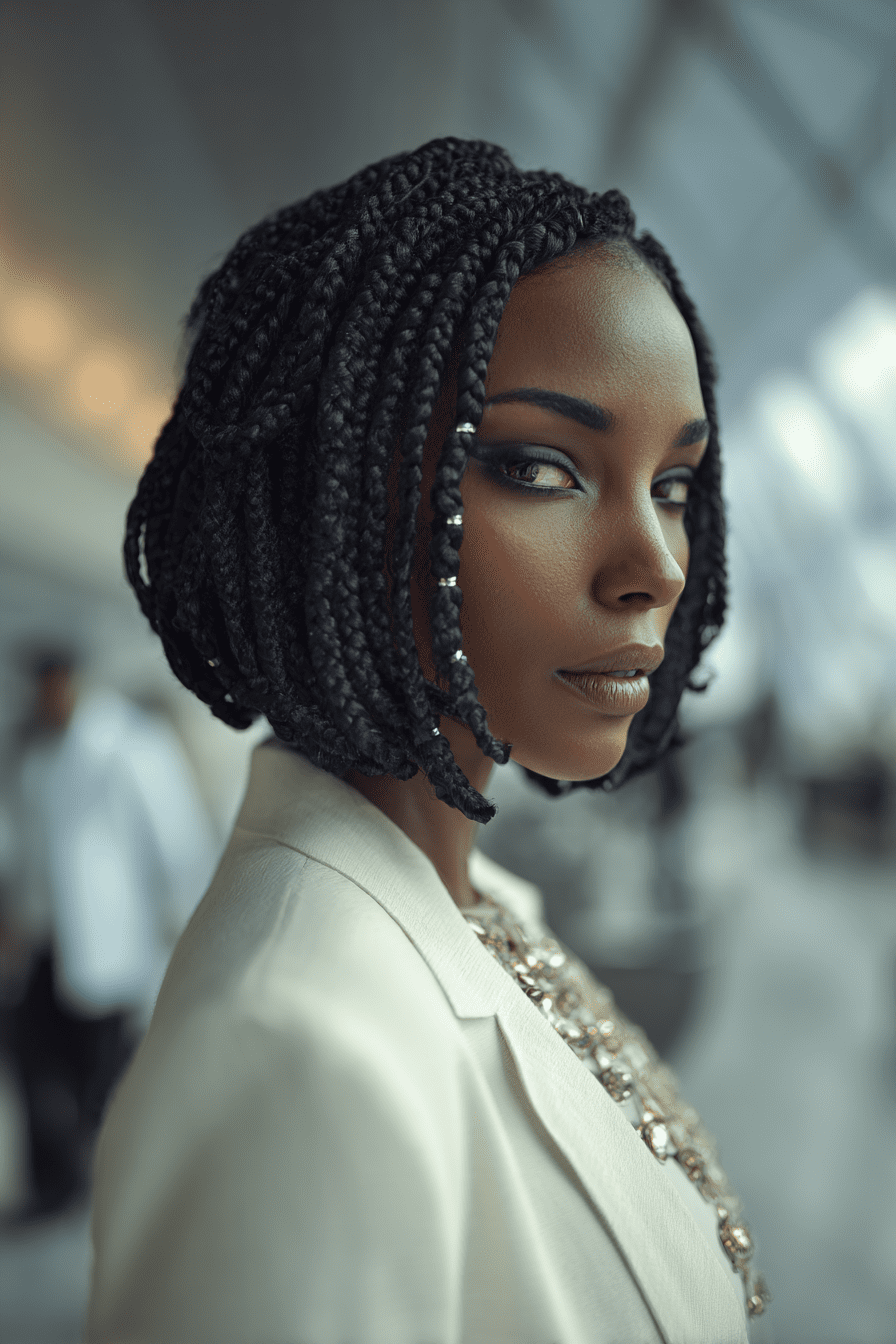 The braided bob is a stylish and protective way to care for your natural curls while looking amazing! This short, neat style features braids that sit right around the chin, keeping your hair safe from breakage and daily stress. It adds volume, shape, and a ton of personality. Best of all, it’s low-maintenance—just wrap it at night and go! A perfect choice for rocking your natural beauty with flair and ease.