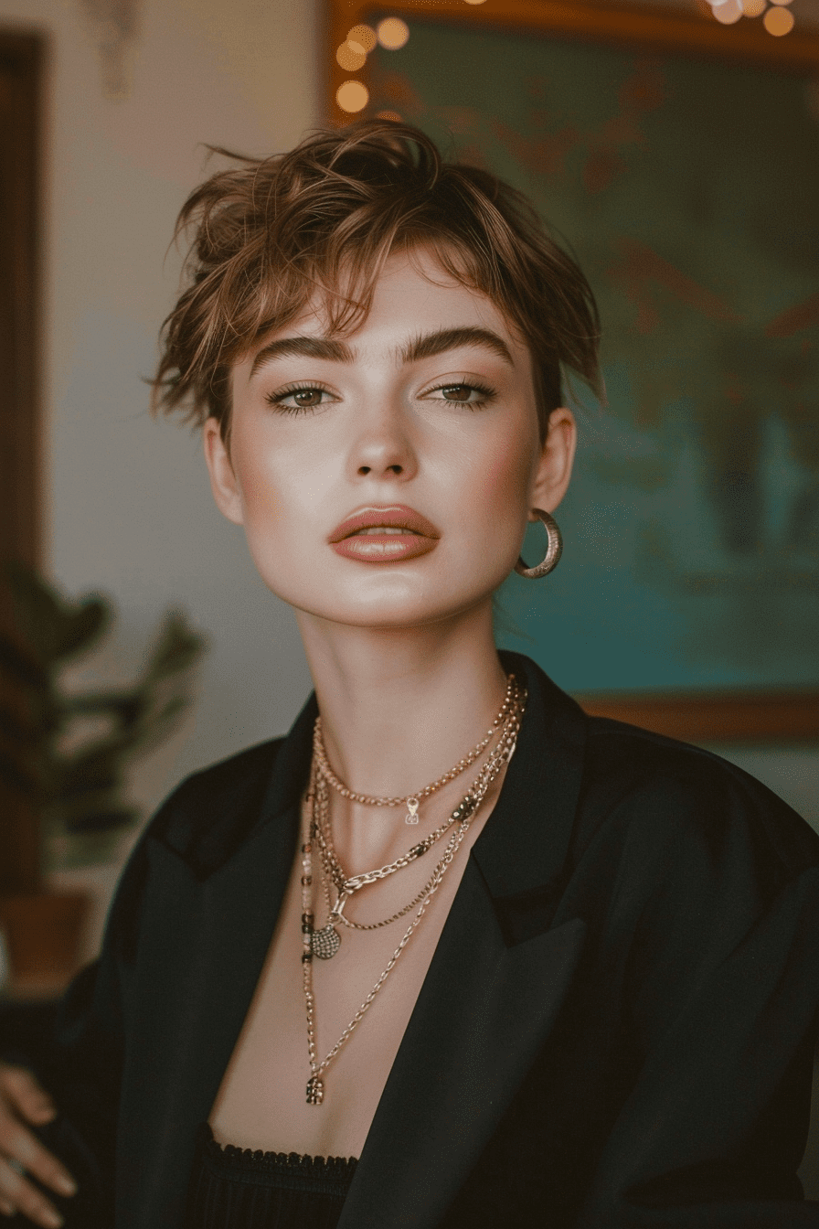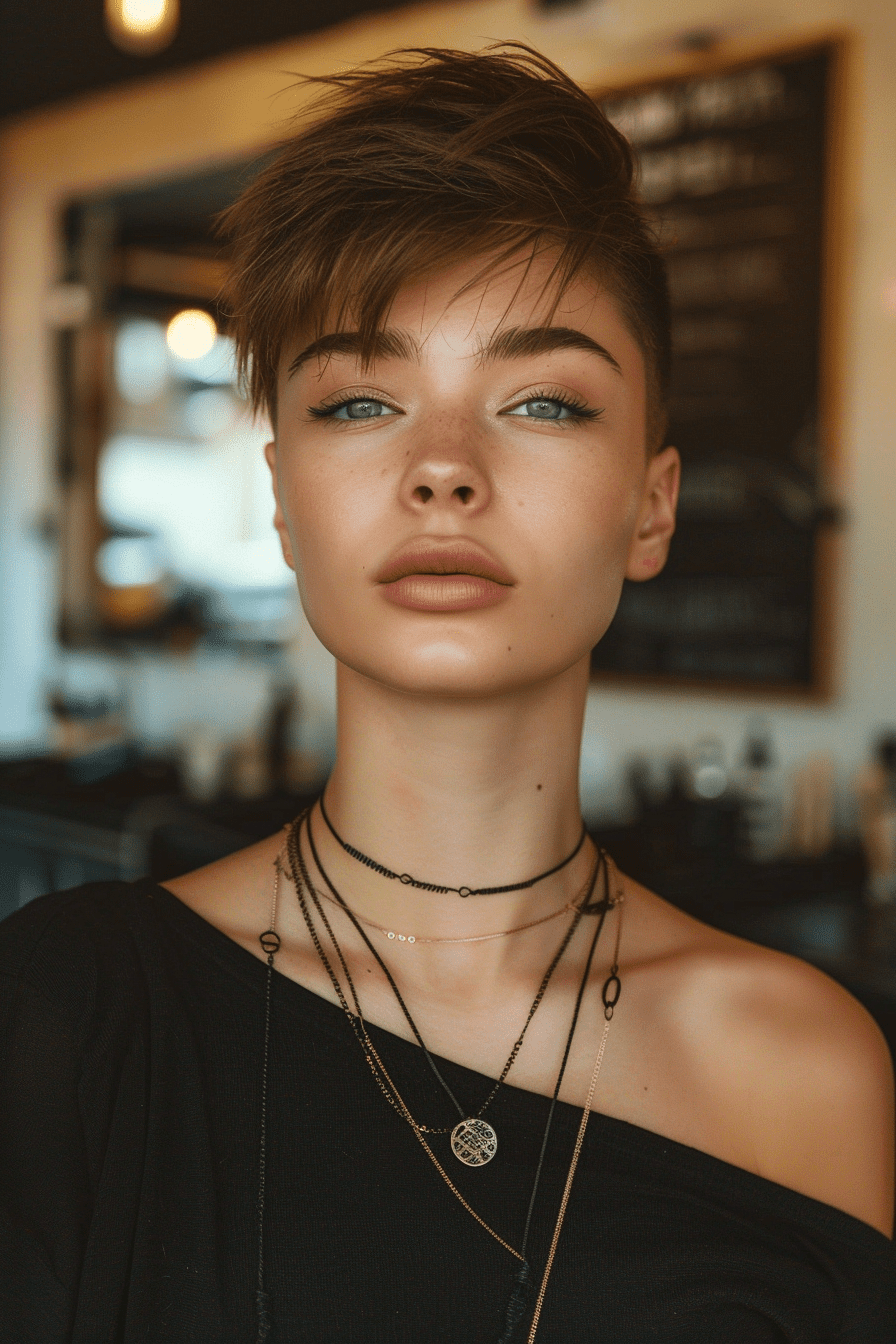 The volume at the crown makes this pixie a standout. On an oval face, it elongates the features in the best way.