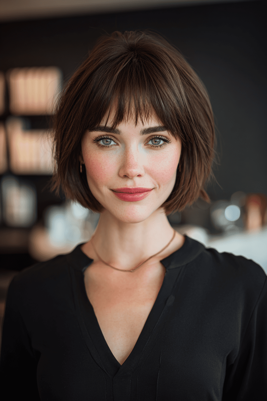 The stacked bob with curtain bangs is playful yet sophisticated—it frames my face gently while giving my fine hair more shape and body. The layers at the back create volume without effort.