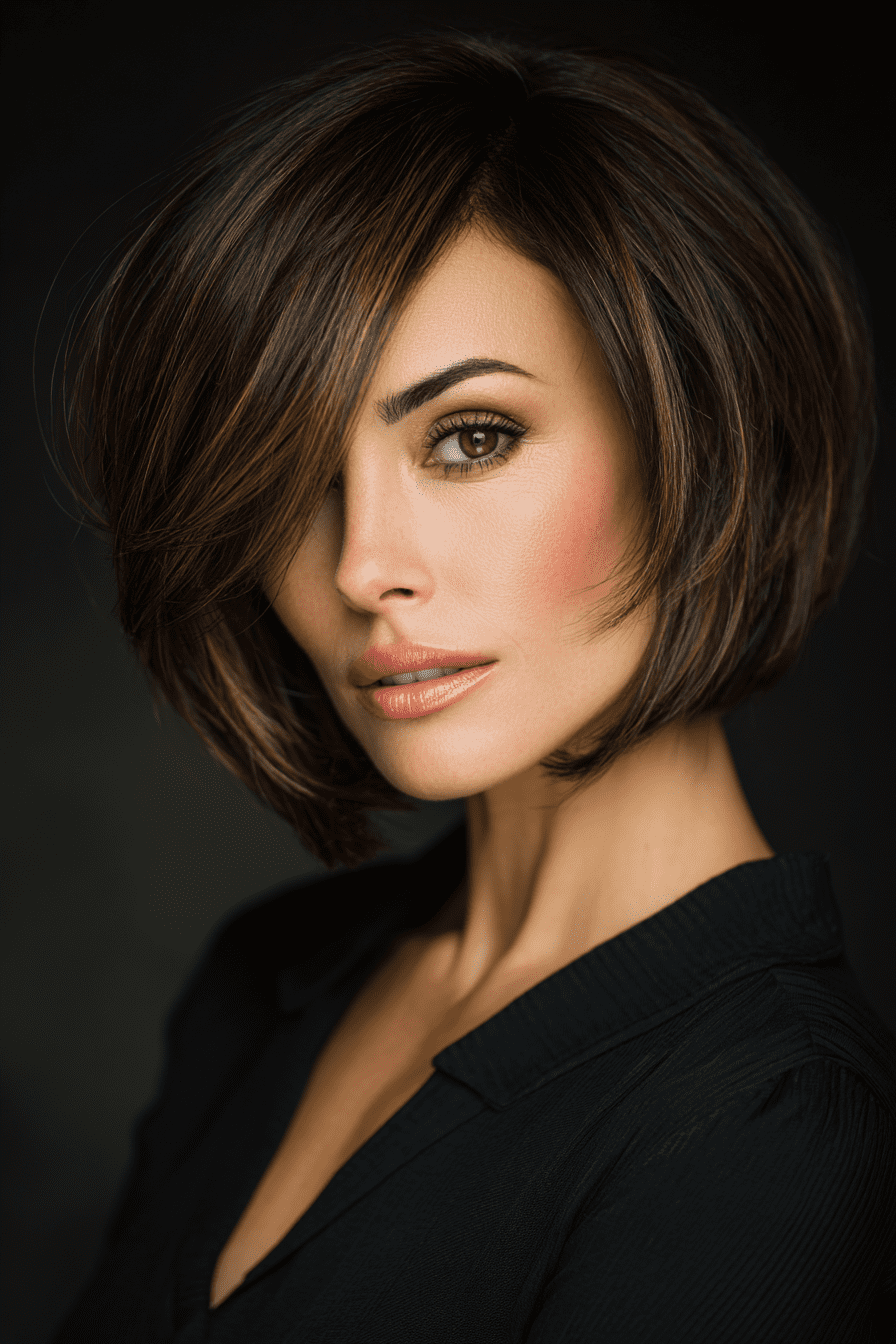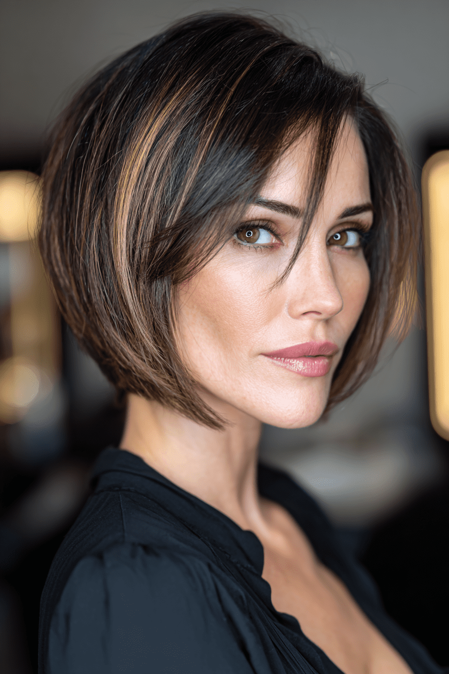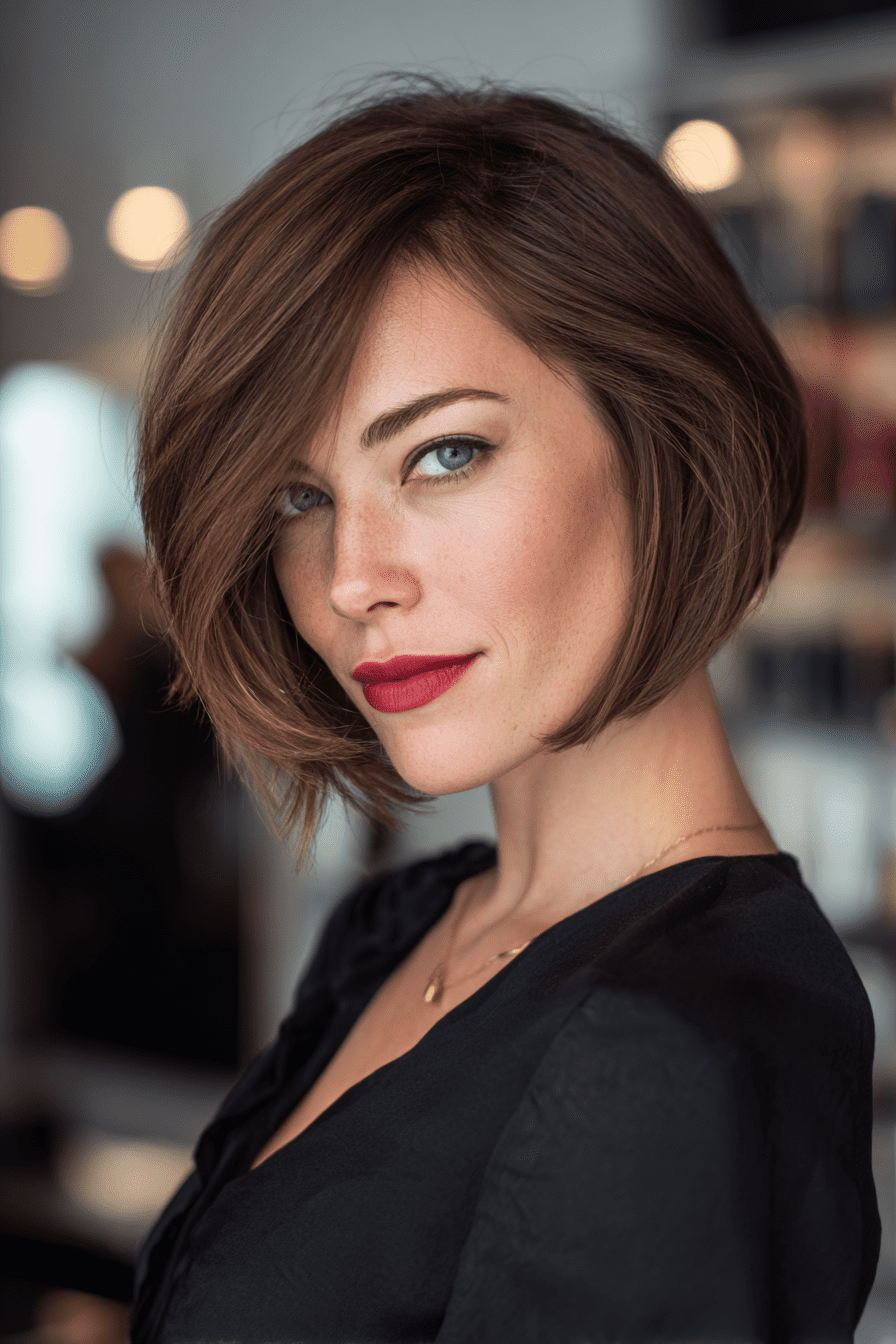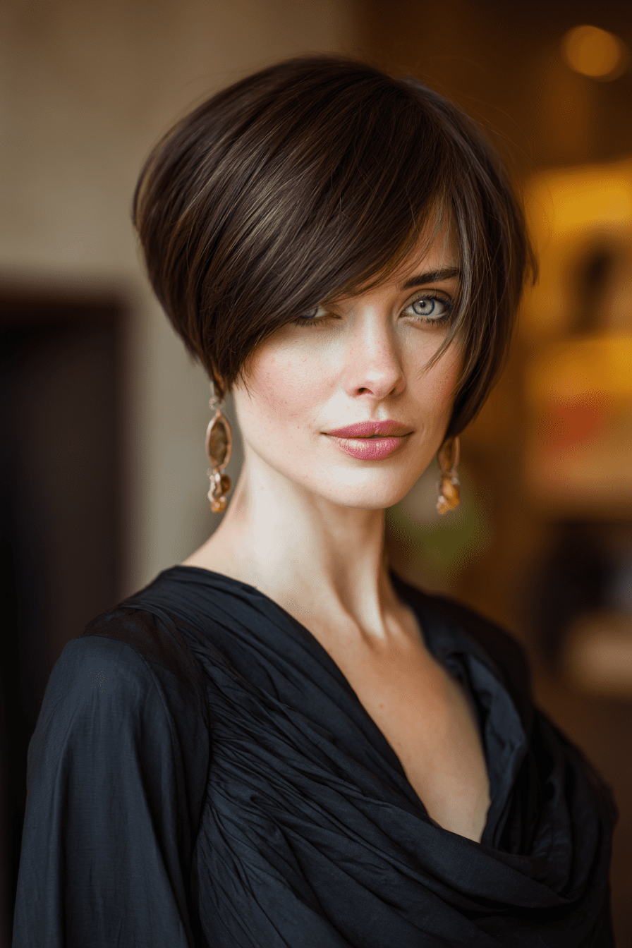 8. Stacked Bob with Side-Swept Bangs