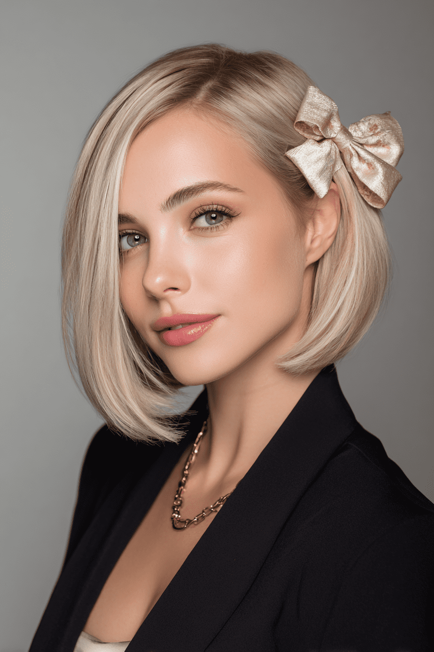 The stacked bob with a bow feels feminine and whimsical. The bow draws attention to the back where the layers are lifted, making fine hair look fuller.