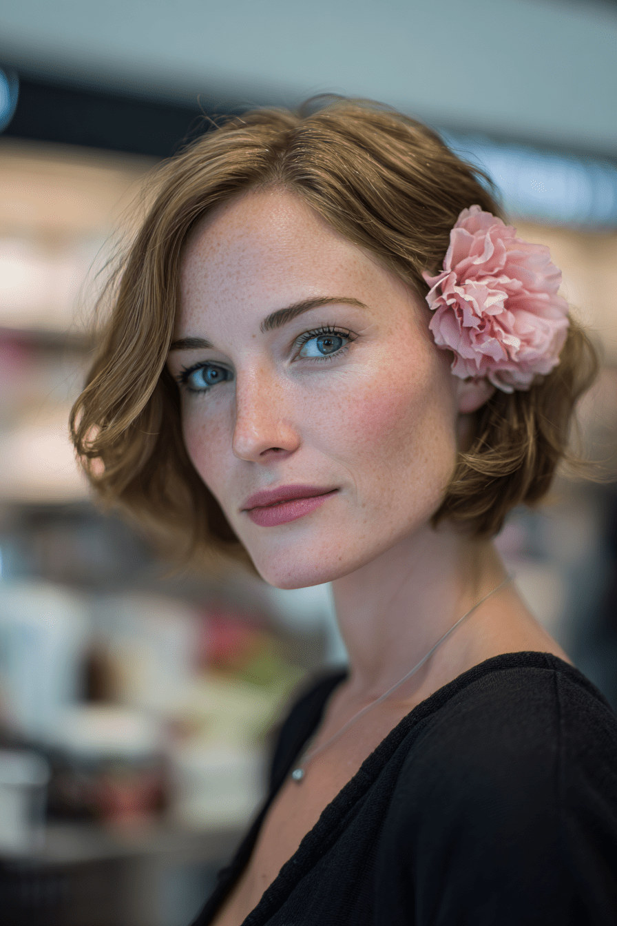 A flower accessory takes my stacked bob to romantic territory. The softness of a bloom contrasts beautifully with the structured cut, giving fine hair a feminine touch.